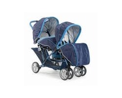 Прогулочная коляска для двоих, компактно складывается, ширина коляски такая же, как у одиночной, маневренная, заднее сиденье расположено выше переднего, поэтому оба малыша имеют хороший обзор, подставки для игрушек спереди и сзади, отдельный тент для каждого ребенка