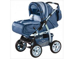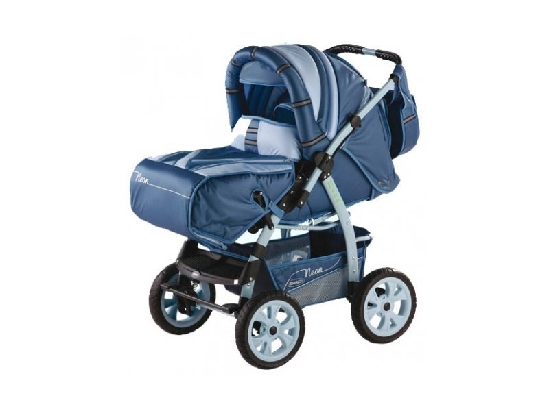 Коляска - трансформер. Колеса из вспененной резины, рама с амортизаторами, перекидная и регулируемая по высоте ручка. В комплект входят: дождевик, москитная сетка, сумка для мамы, корзина для продуктов, столик для ребенка, люлька-переноска.